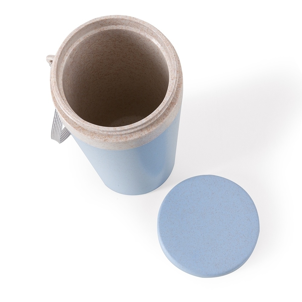 Possui uma tampa de vedação rosqueável e alça de nylon (removível) para transporte. O copo pode ser levado a lava-louças, geladeiras e micro-ondas.