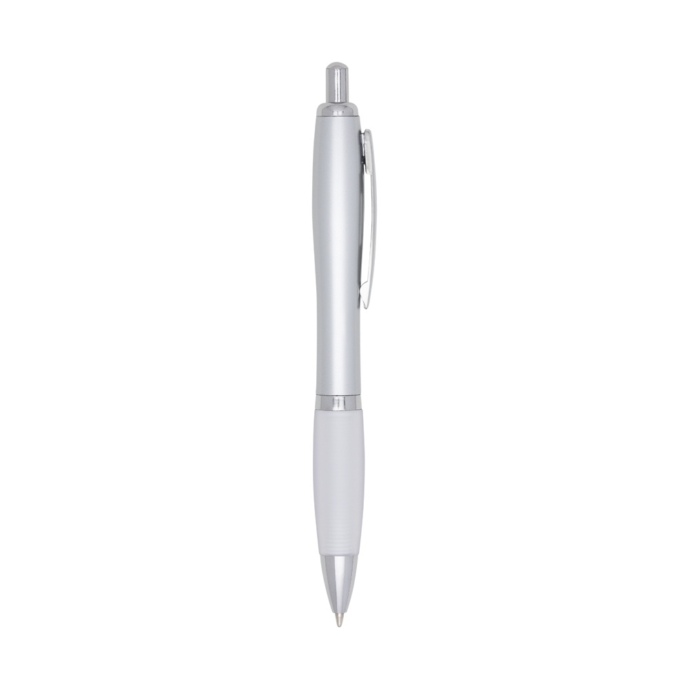 Caneta plástica prata com anel e detalhe emborrachado colorido. Clip de metal, aciona por clique.