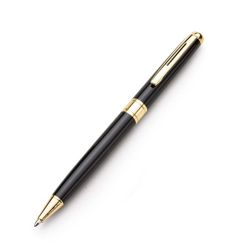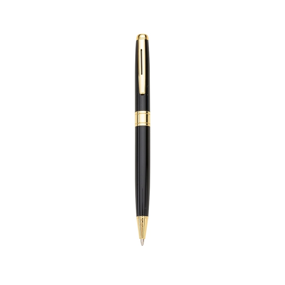 Caneta metal esfero preta com detalhes em dourado, possui clip metálico com detalhe central vazado. Aciona por giro.