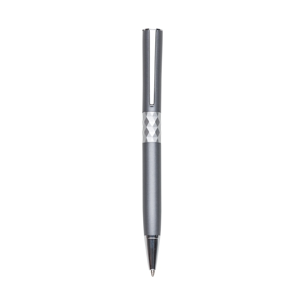 Caneta metal com detalhe texturizado no centro. Possui clip metálico, suporte e ponteira brilhantes em prata. Aciona por giro.