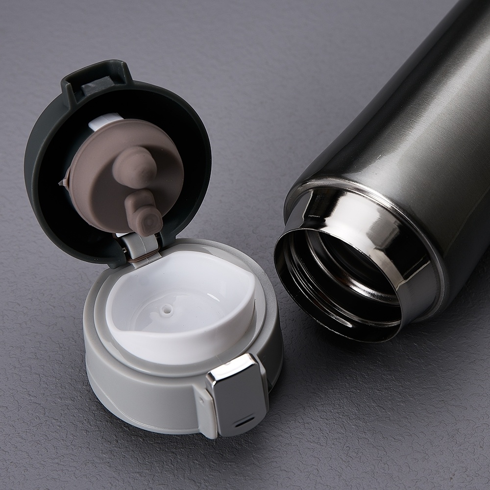 Garrafa térmica 350ml colorida com sistema de trava. Material metálico com revestimento interno em inox, possui tampa plástica fosca com borracha interna para vedação evitando o vazamento de líquido e prezando sua temperatura; possui botão central para abertura e trava lateral(basta seguir a orientação dos desenhos de cadeados simulando o travamento/destravamento da tampa).