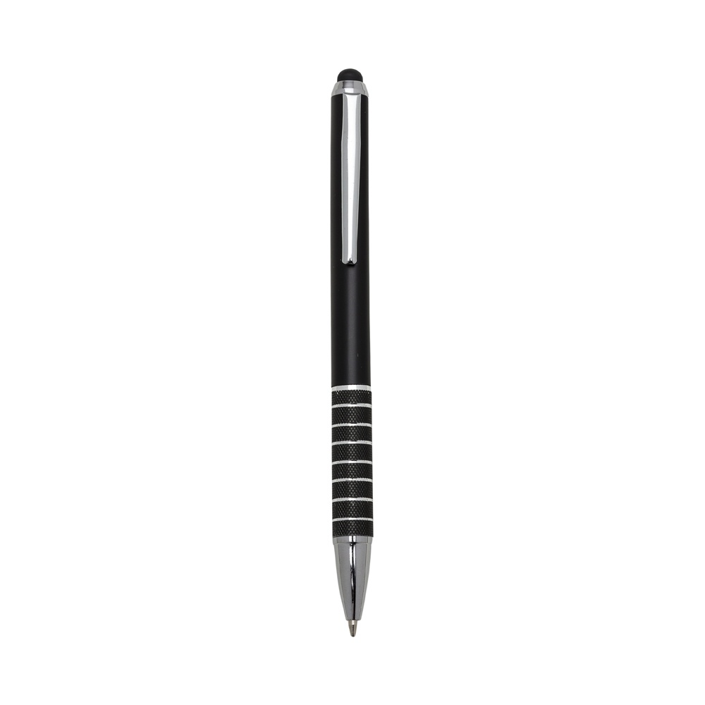 Caneta plástica esferográfica e touch, inteira colorida com detalhes prata. Clip metal, possui oito anéis com relevo na parte inferior. Aciona por giro.