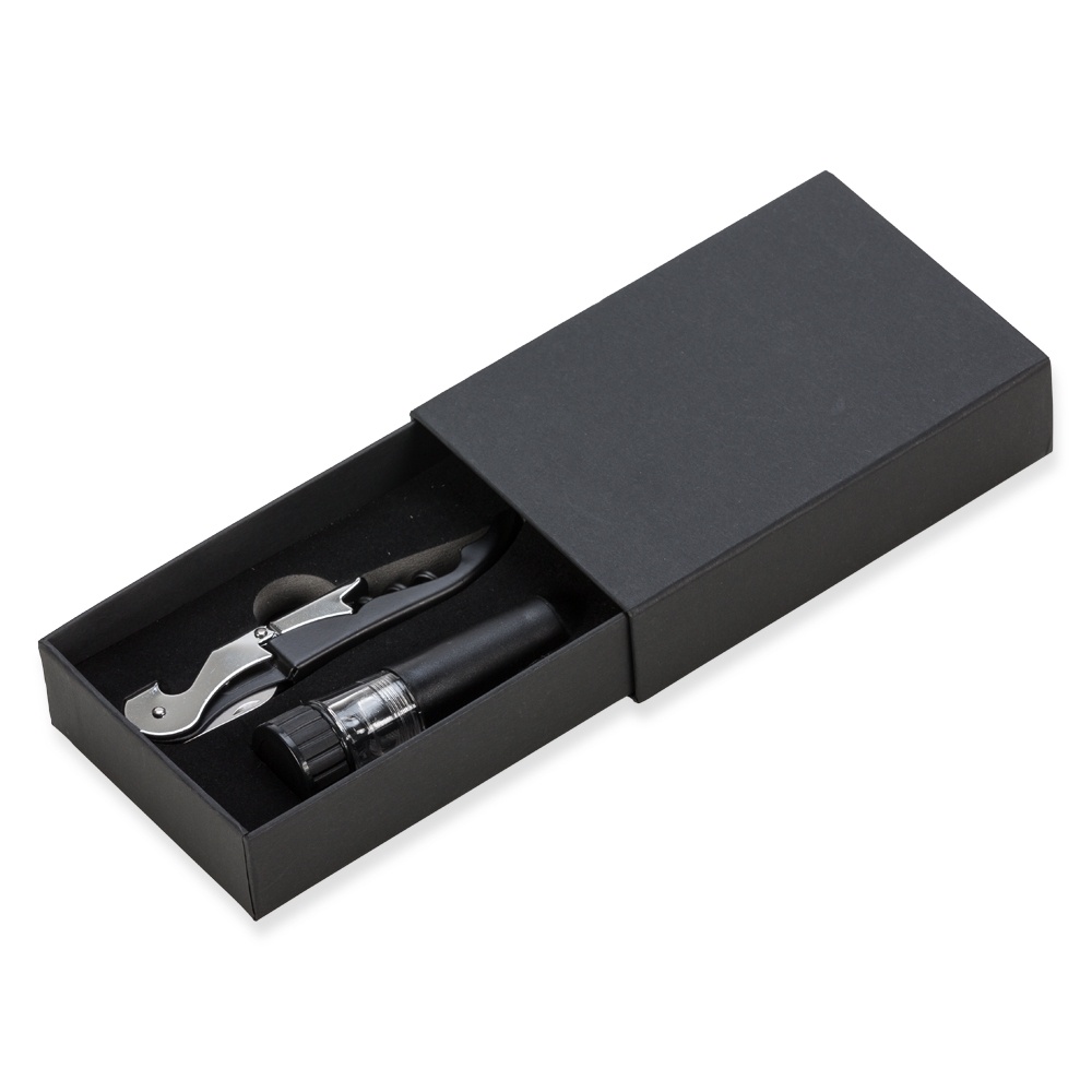 Kit vinho 2 peças em estojo de papelão. Estojo com tampa removível e parte interna revestida de espuma. Possui tampa à vácuo e saca rolhas.