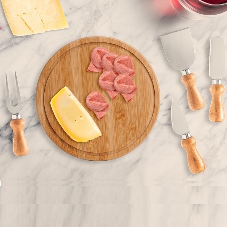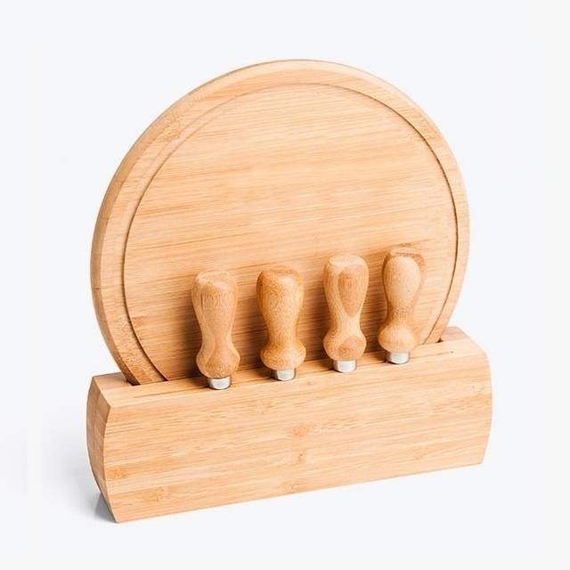 Composto por tábua redonda de bambu com Ø 21,5cm, quatro acessórios para queijo com cabos em bambu e lâminas em inox, sendo um Cheese Fork para queijos mais duros, uma Parmesan Knife para queijos parmesão, uma Cheddar Spatula para queijos tipo Cheddar ou Brie e uma Stilton Spatula para queijos macios tipo mussarela.