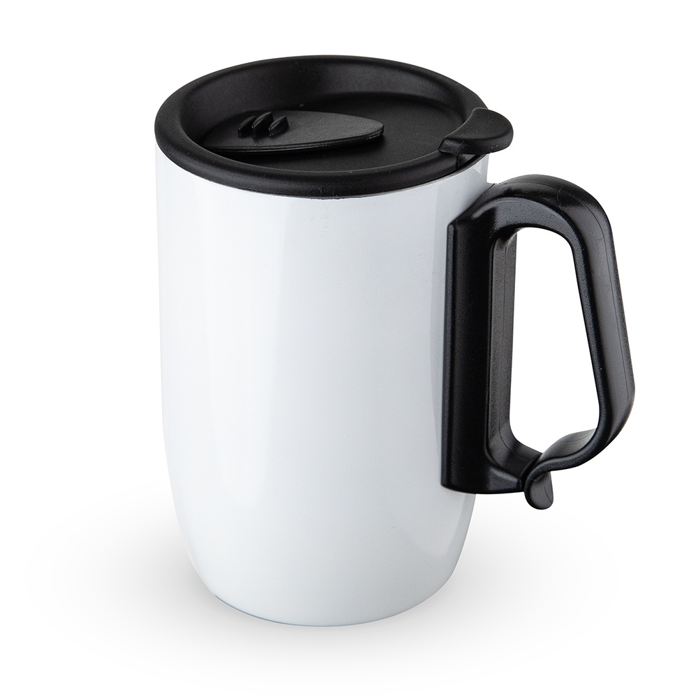 Caneca 400 ml parede dupla em Inox, com pegador de plástico, contém tampa com compartimento que ao deslizar, pode ser aberto para beber e base com EVA antiderrapante.