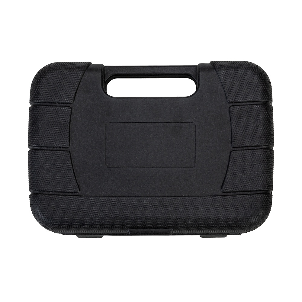 Kit ferramenta 8 peças em estojo plástico. Maleta plástica com detalhe retangular no centro frontal e verso liso, possui texturização no estojo e duas travas superiores. Acompanha: fita isolante, martelo, alicate, chave Philips, chave teste, chave de fenda, trena 2 metros e estilete.