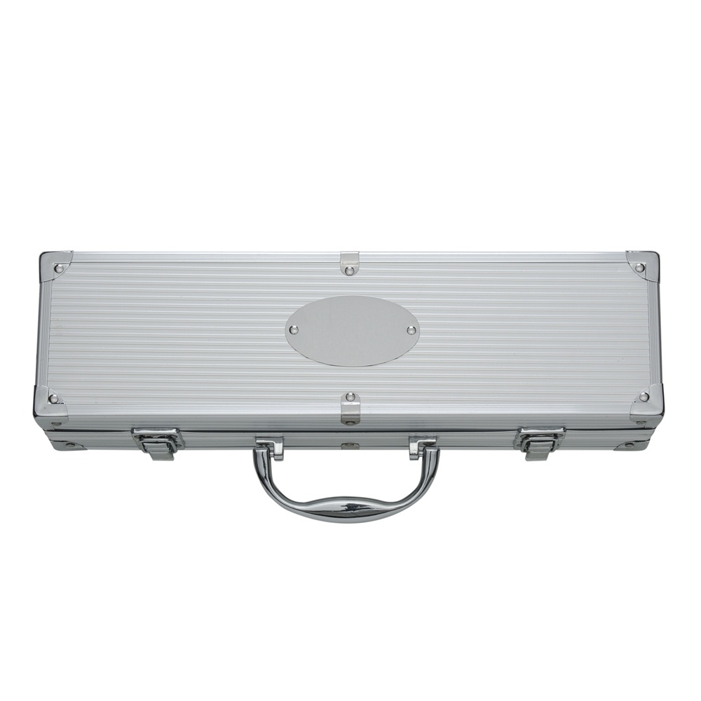 Kit churrasco 4 peças em maleta de alumínio com travas de segurança, contém: espátula, pegador, garfo e faca em inox. Parte interna da maleta com revestimento em tnt e suportes de velcro para fixação das peças.