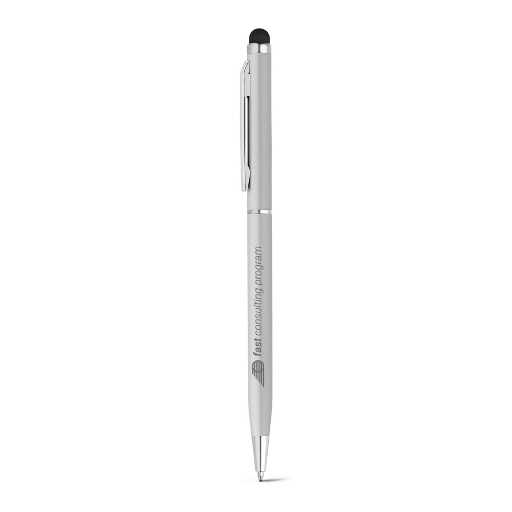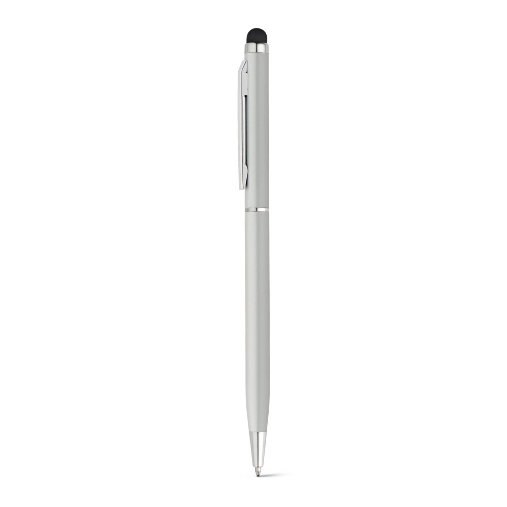 Esferográfica em alumínio com mecanismo twist, clipe e ponteira touch.