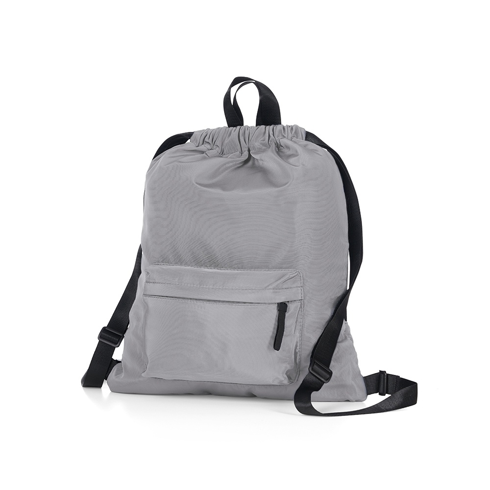 Mochila saco em poliéster resistente à água com bolso frontal. A mochila possui duas alças de mãos e área costada antitranspirante.