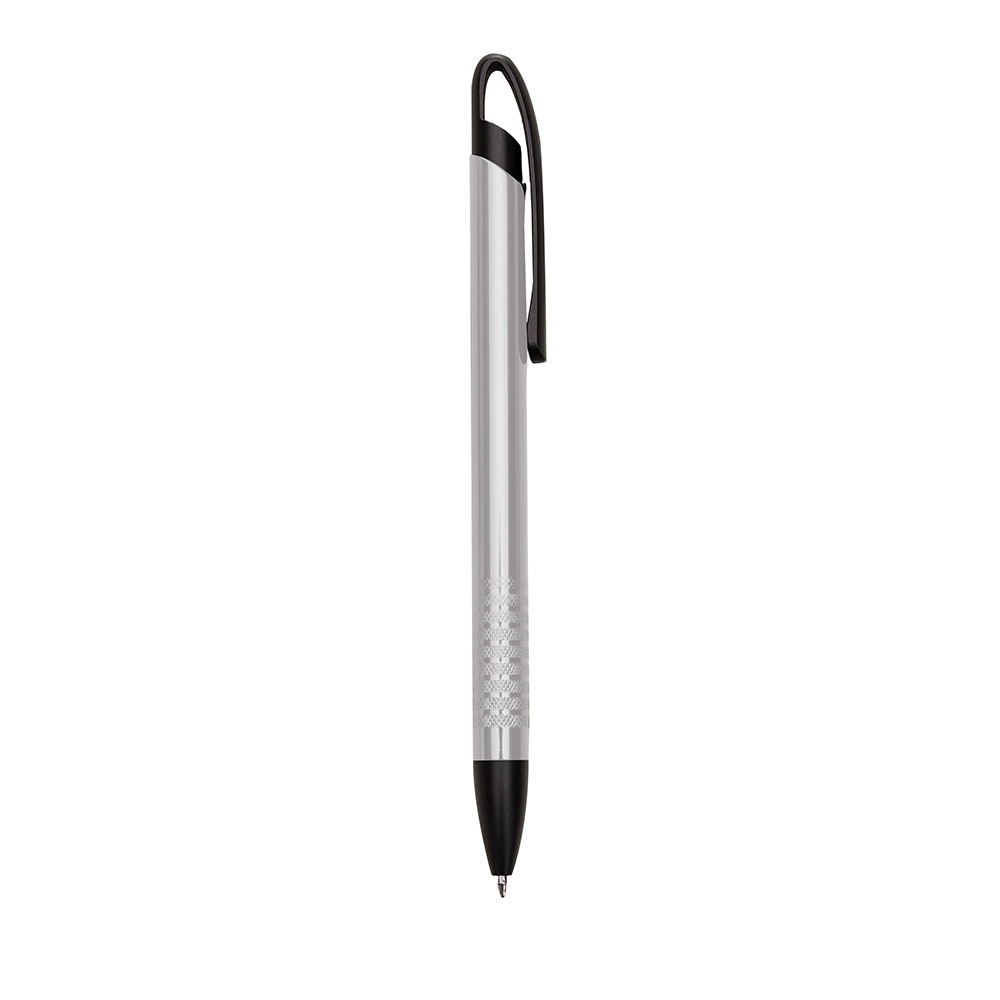 Caneta semimetálica com carga esferográfica azul e acionamento por clique.