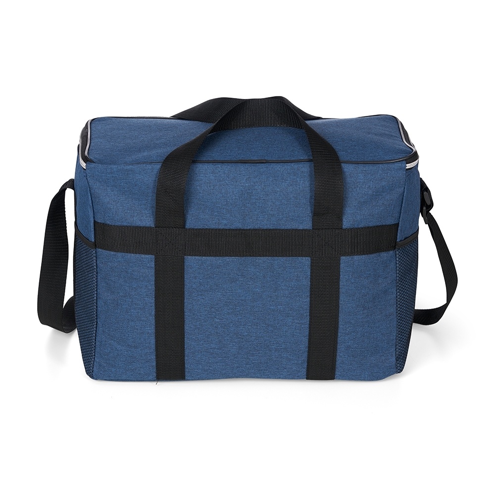 Bolsa térmica de poliéster oxford 300D de 33 litros com bolso frontal e bolsos laterais em malha.