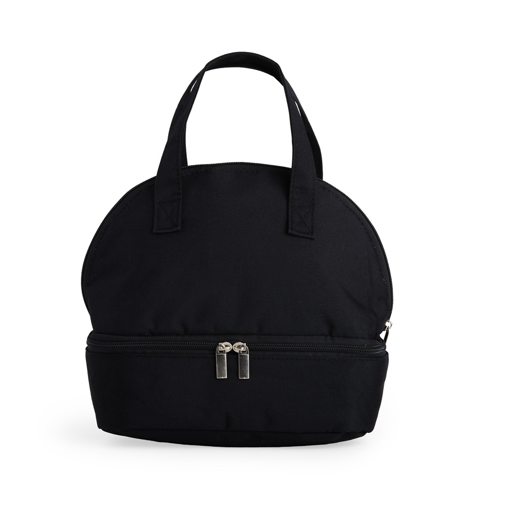Em oxford com dois compartimentos térmicos isolados, capacidade de 6 litros. Contém alças de mãos.