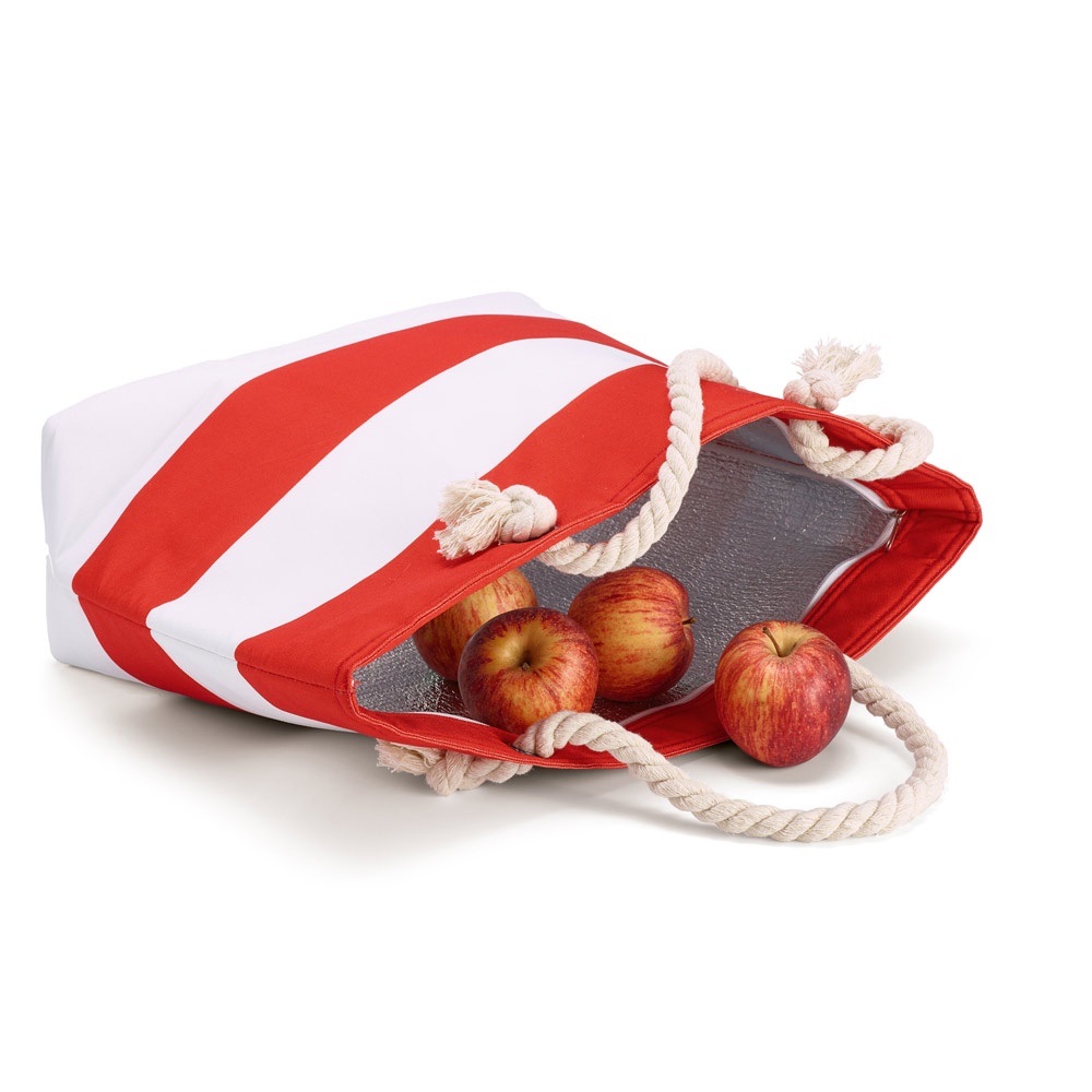 Sacola térmica em 600D poliéster reciclado (100% rPET) e alça em algodão com 65 cm. Contém um bolso principal com isolamento e 1 bolso frontal..