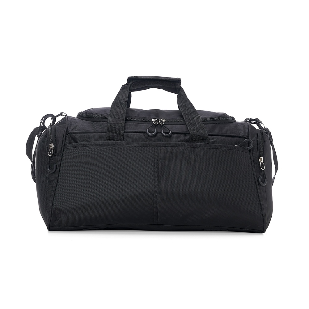 Bolsa de viagem de 28 litros em poliéster oxford resistente à água com quatro compartimentos. Contém alça de mãos com suporte de juntura, bases antiderrapantes e acompanha alça transversal com suporte de apoio para ombro.